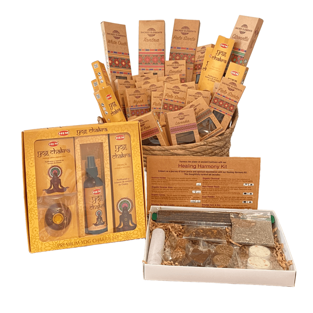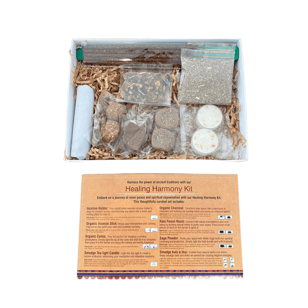 El Set Healing Harmony Kit contiene 5 sahumerios orgánicos, 2 conos orgánicos, 2 discos orgánicos, 2 bombitas orgánicas, 2 velas de noche naturales, 10 carbones naturales, 5g de polvo Natural White Sage, 25g de resina Natural Rain Forest y un porta sahumerio de madera.