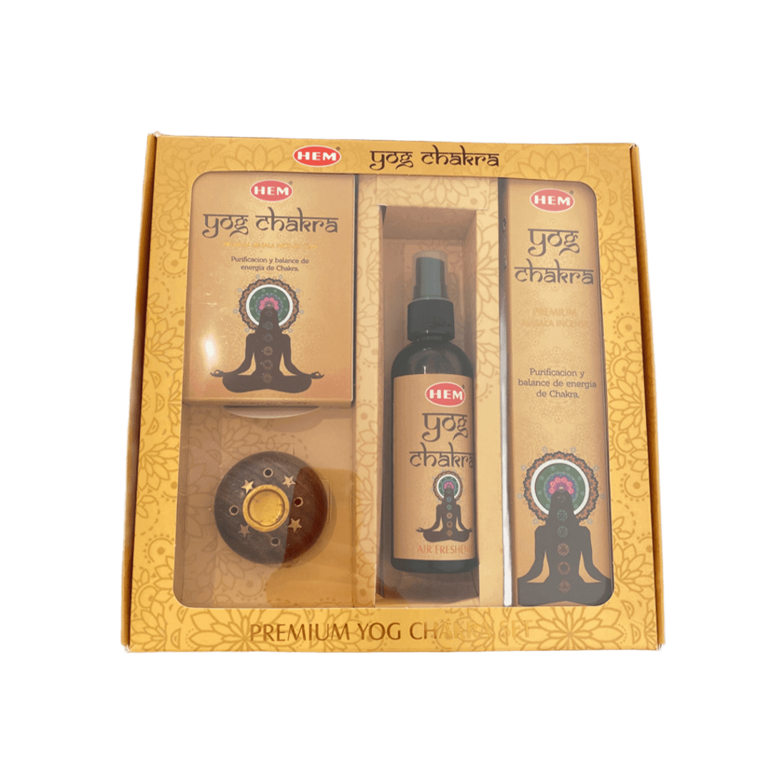 El Set Yog Chakra contiene 1 paquete de sahumerios masala 15g, 1 paquete de conos, un spray y un porta sahumerio de madera.